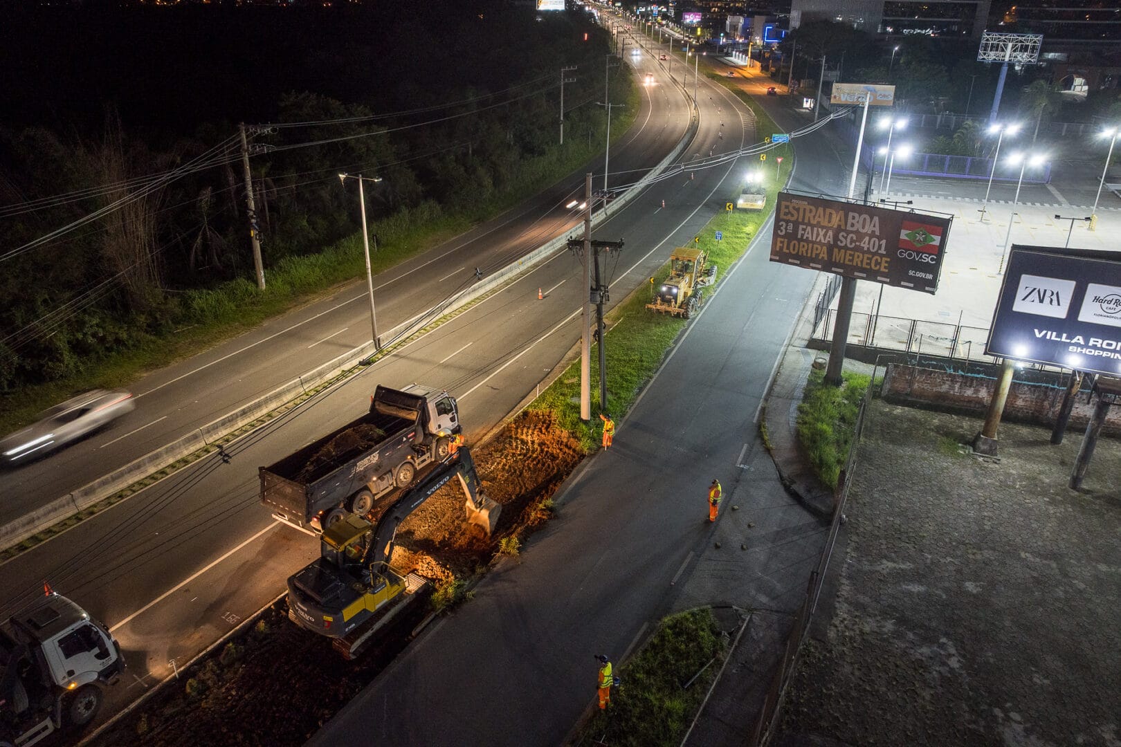 A obra começou pela região de centros comerciais como o Direto do Campo e a Decathlon. Segundo a secretaria, haverá outra frente de trabalho na região do Morro das Madeireiras, considerado o ponto mais crítico da SC-401 atualmente.