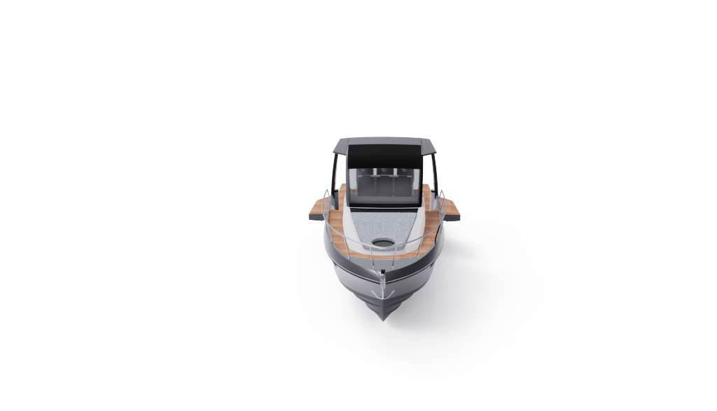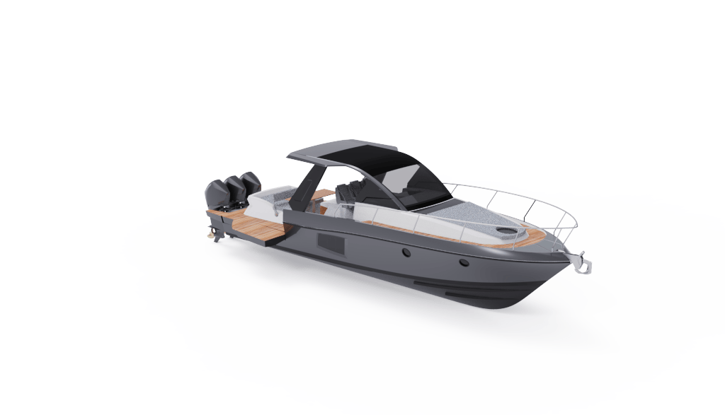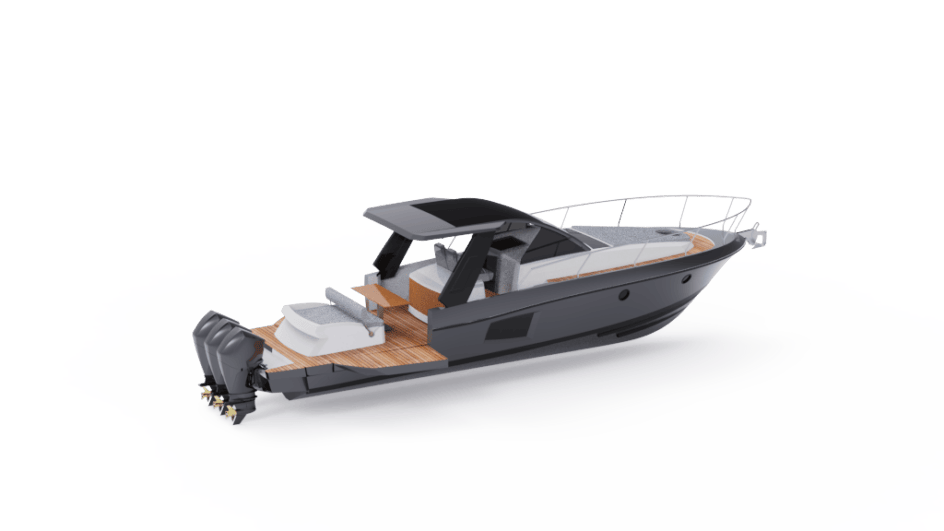 O parabrisa inteiriço e a targa inspirada em modelos europeus trazem o DNA esportivo da embarcação. Na popa, duas portas hidráulicas expansíveis criam uma área de convivência integrada ao mar, que transforma o deck em um lounge sobre as águas. Na proa, há um amplo solário, enquanto os passadiços laterais rebaixados trazem um guarda-mancebo. A bordo, o cockpit esportivo oferece comandos com joystick intuitivo e sistema de manobra de alta tecnologia.