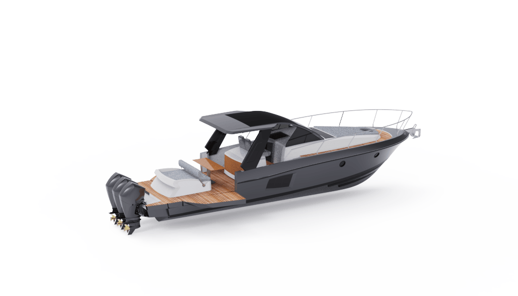 Sob o casco em V profundo — assinatura da marca — três motores de popa, de 300hp ou 400hp, ou a opção de dois motores centro-rabeta de 350hp. Internamente, a cabine de meia-nau, totalmente privativa, traz janelas panorâmicas.