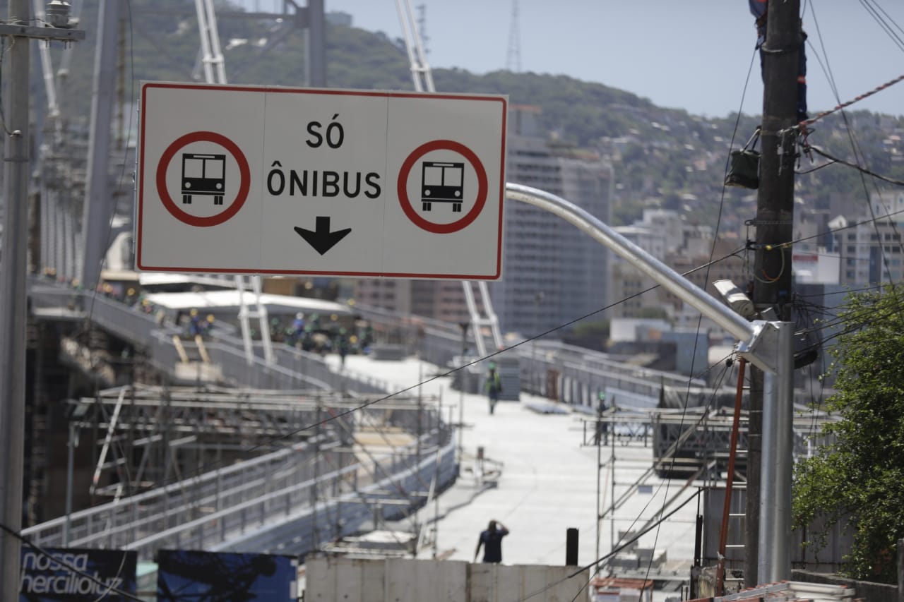 As primeiras placas instaladas na cabeceira Continental da ponte Hercílio Luz, em Florianópolis, mostram quais veículos terão prioridade para uso da estrutura. Assim como planejado pela prefeitura, as pistas centrais da Velha Senhora serão exclusivas para os ônibus. Neste primeiro momento, depois da programação de abertura prevista pelo Estado para a semana de 30 de dezembro e 5 de janeiro, veículos de emergência também poderão passar sobre a ponte em deslocamentos.