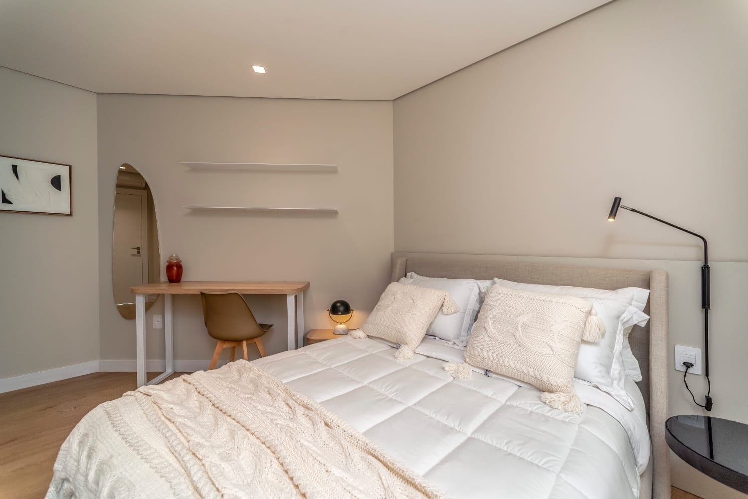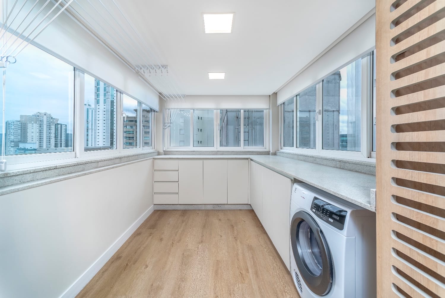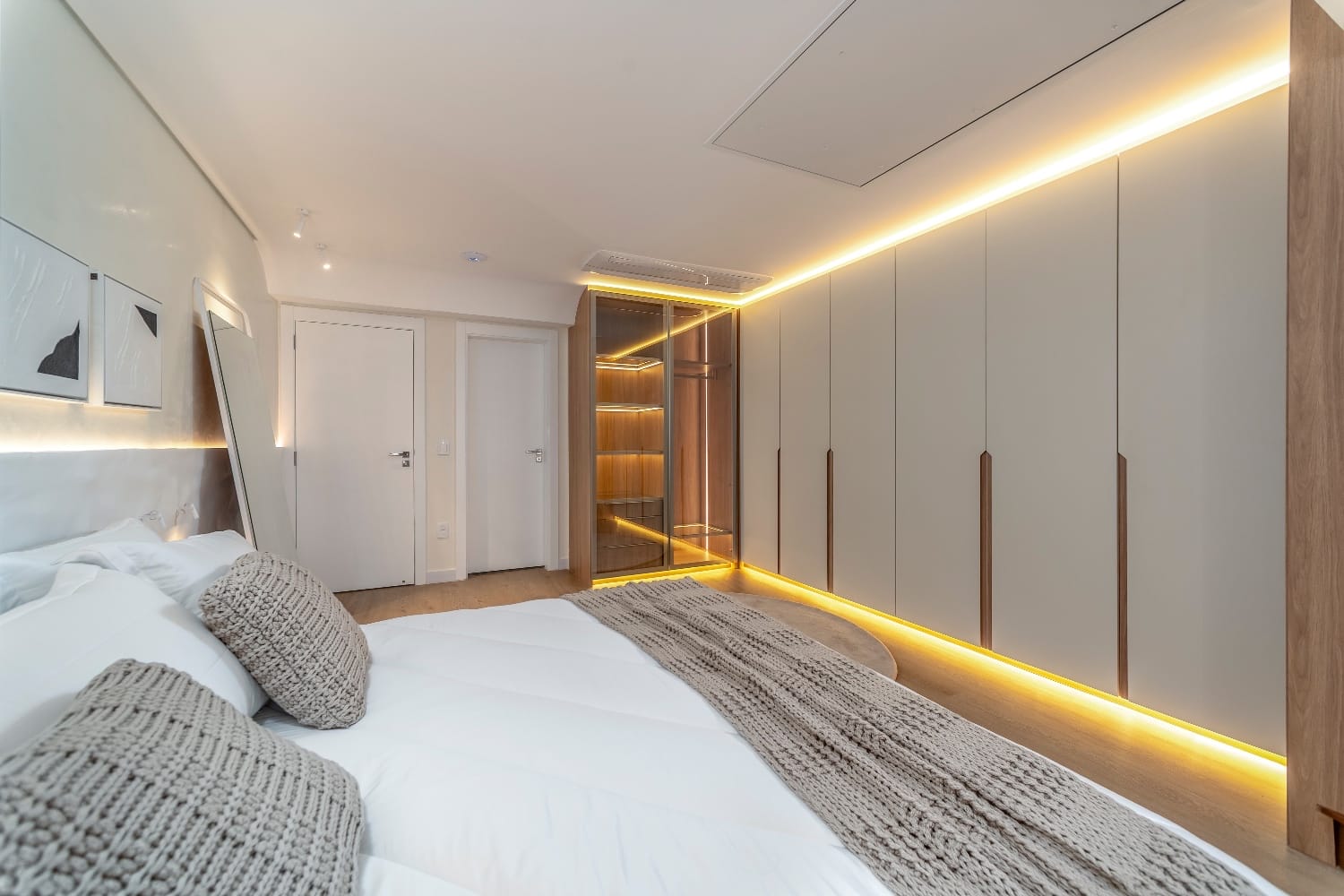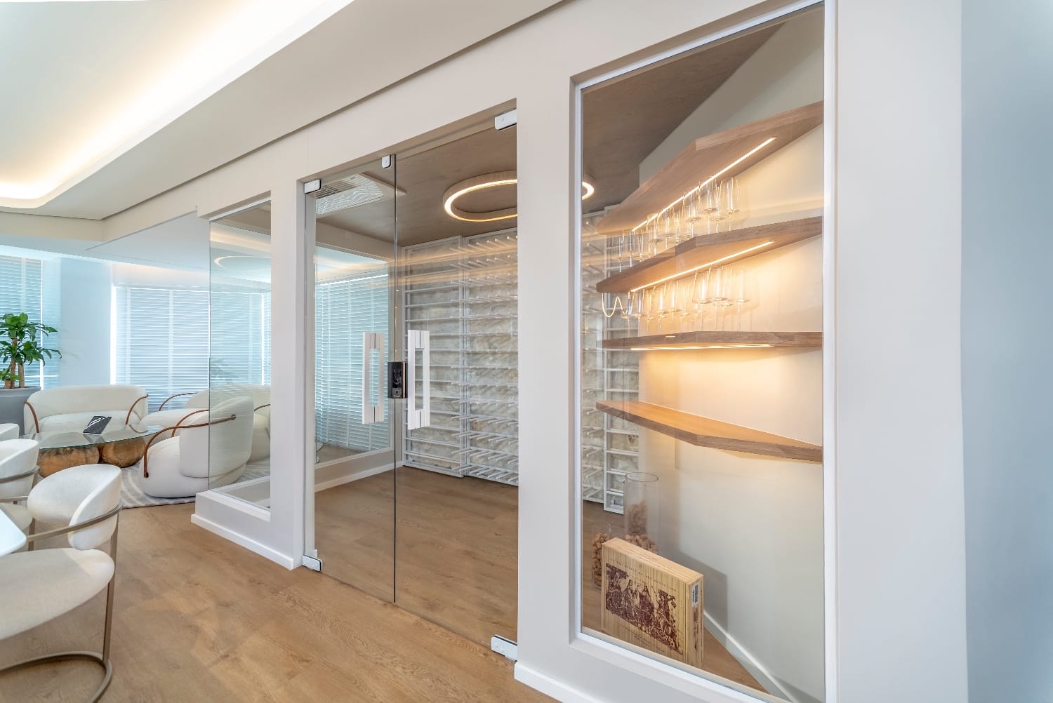 Todo o projeto foi pensado para atender um público que busca luxo, conforto e funcionalidade. O imóvel conta com automação, climatização, piso porcelanato, acabamento em gesso, piso aquecido nos banheiros, móveis planejados e marcenaria sob medida. A cozinha é equipada com eletrodomésticos de alto padrão e há ainda uma adega com capacidade para mais de 200 garrafas. O imóvel possui, ao todo, sete banheiros.