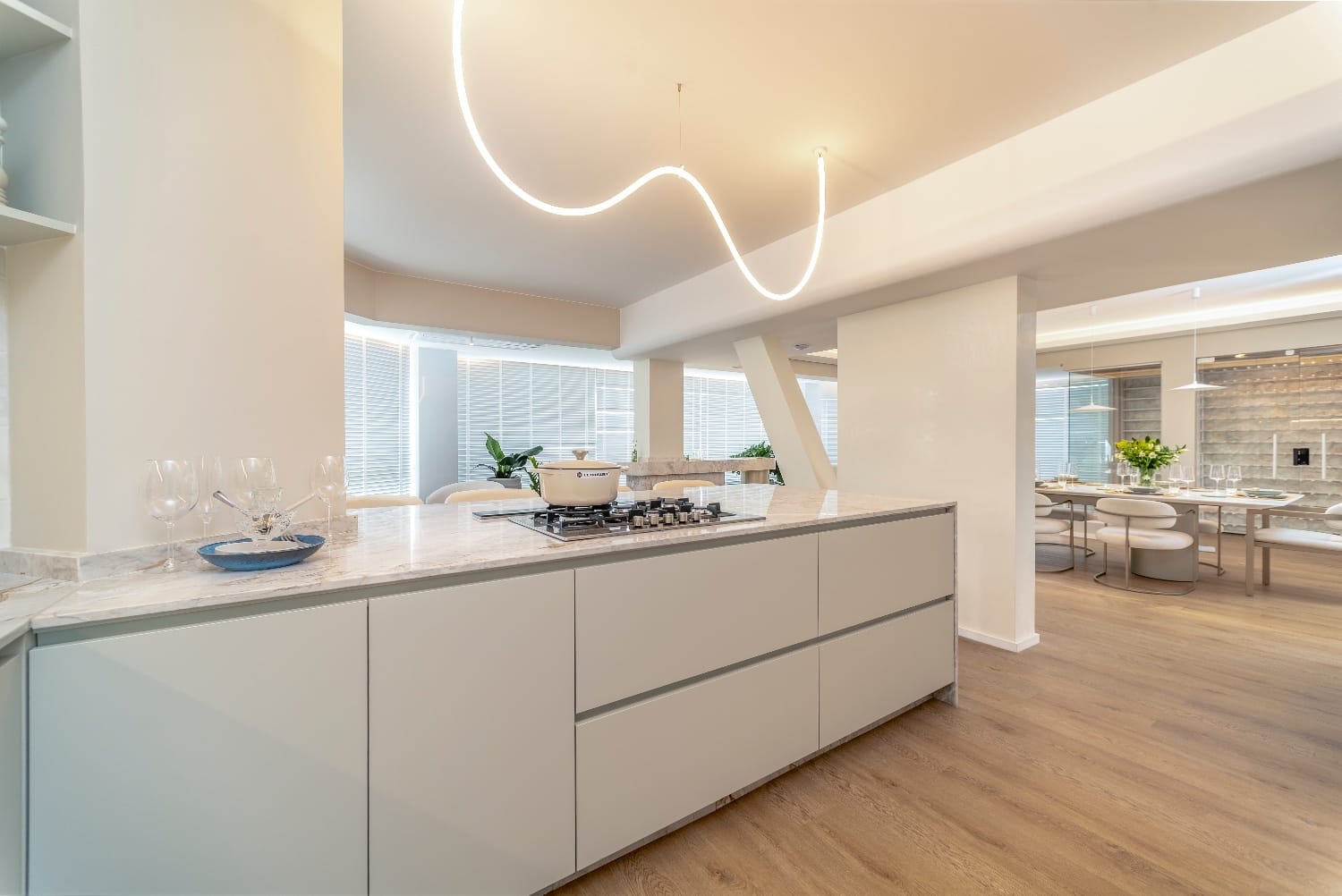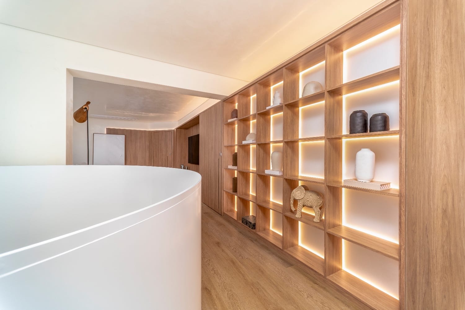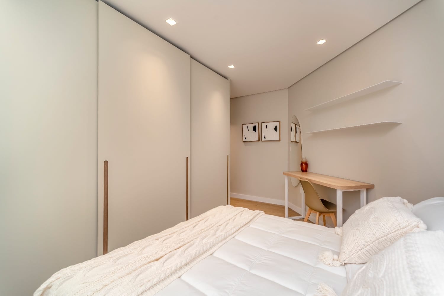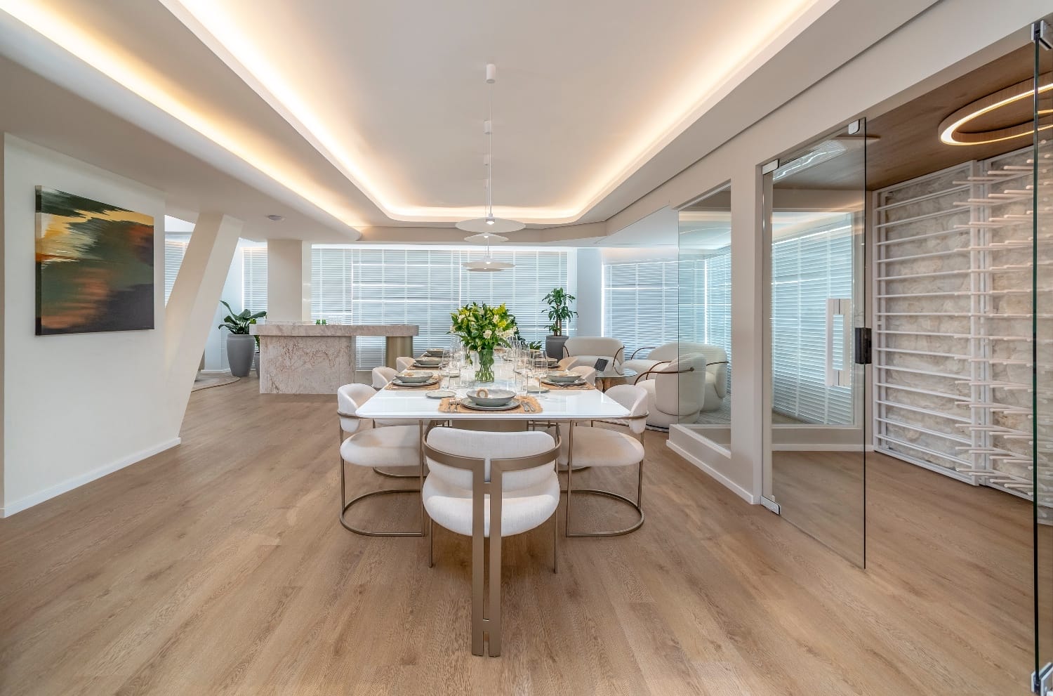Todo o projeto foi pensado para atender um público que busca luxo, conforto e funcionalidade. O imóvel conta com automação, climatização, piso porcelanato, acabamento em gesso, piso aquecido nos banheiros, móveis planejados e marcenaria sob medida. A cozinha é equipada com eletrodomésticos de alto padrão e há ainda uma adega com capacidade para mais de 200 garrafas. O imóvel possui, ao todo, sete banheiros.