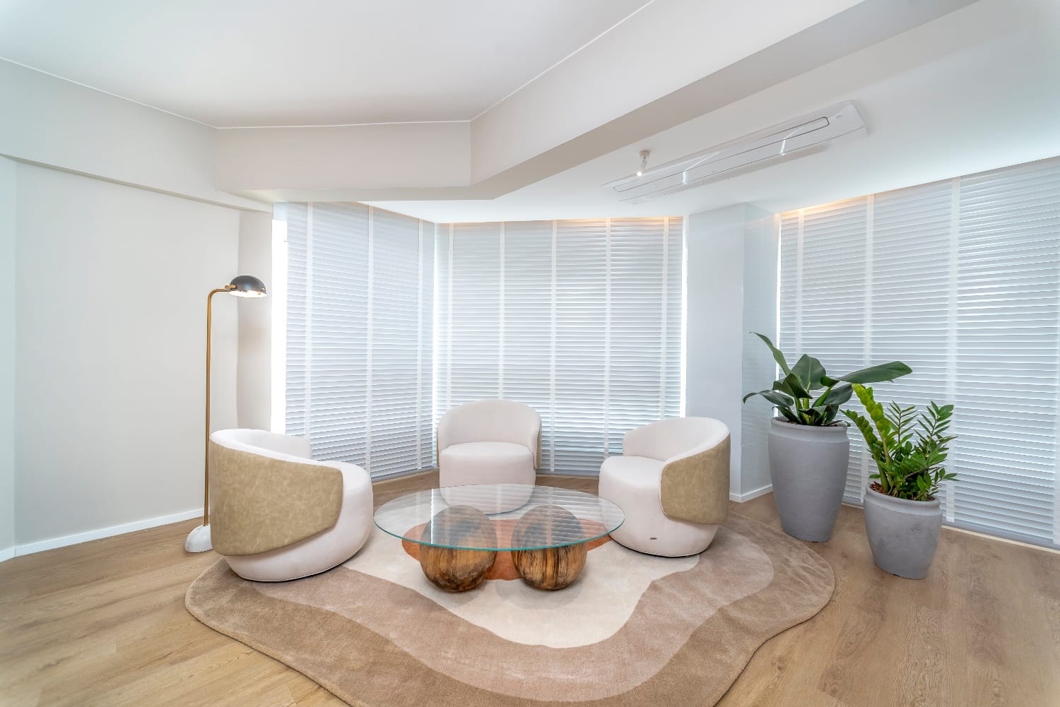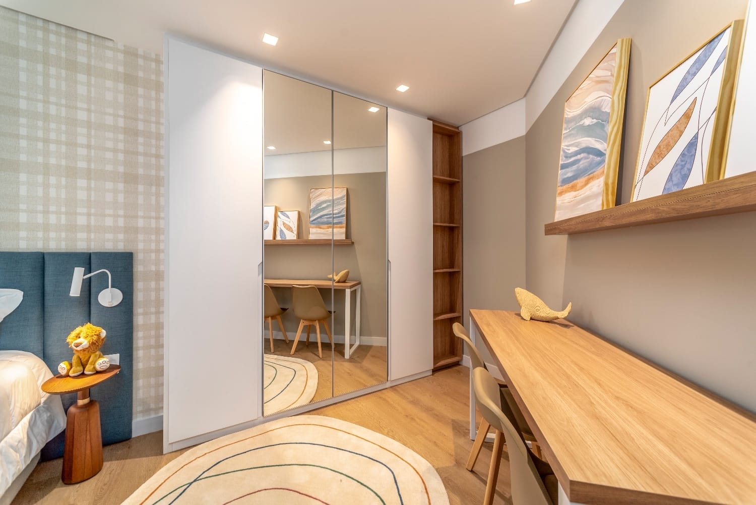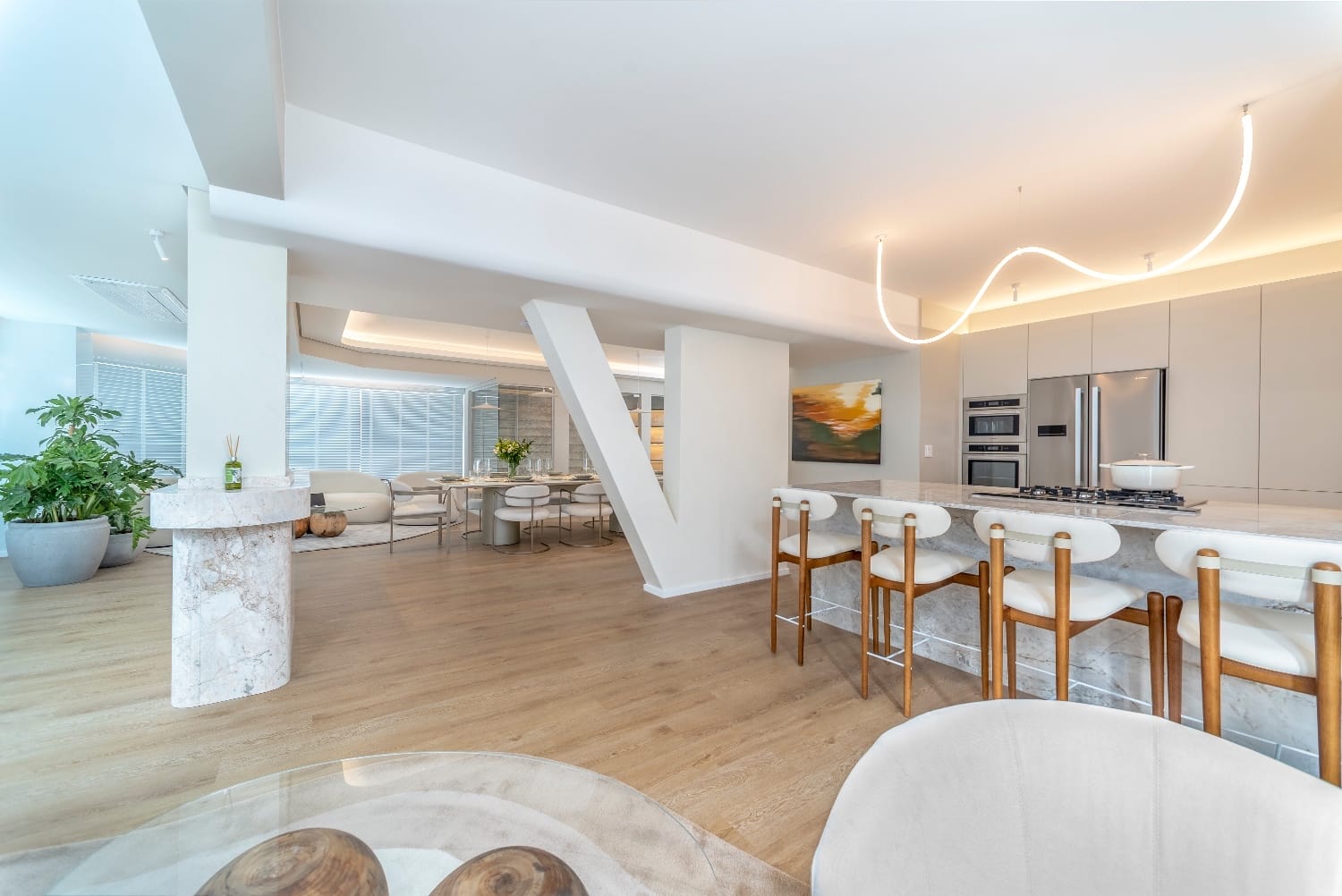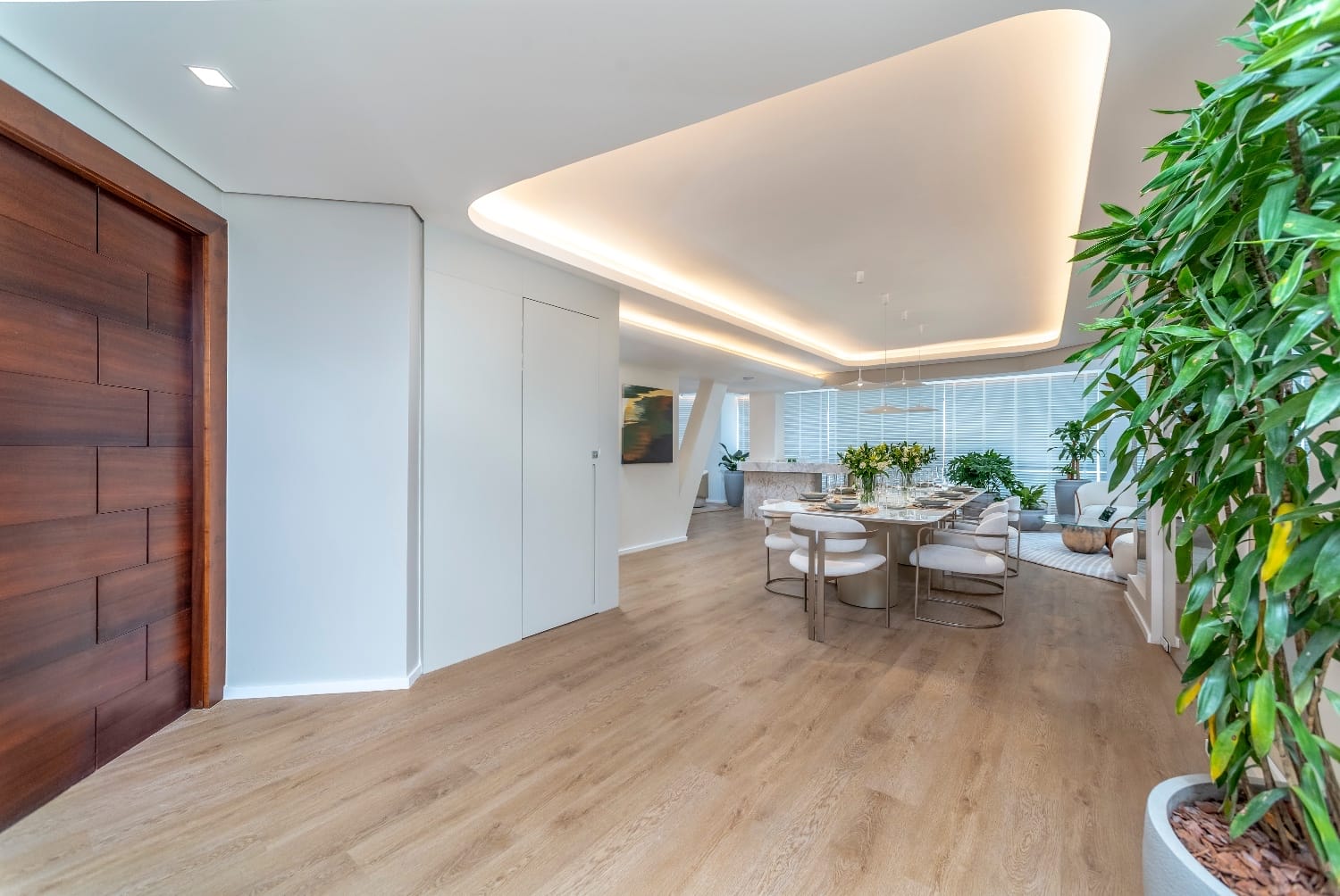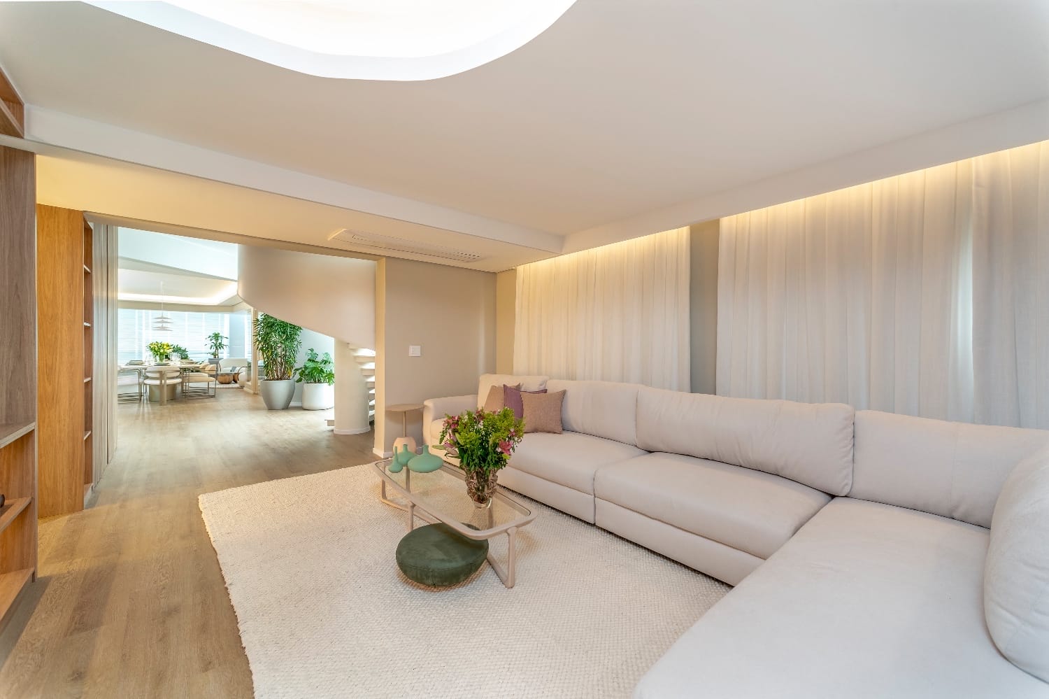 No piso principal, estão as cinco suítes amplas, incluindo uma suíte máster com banheira de hidromassagem e closet, living para três ambientes, sala de TV, sala de jantar, copa/cozinha, área de serviço e dependência de empregada. As esquadrias amplas, a sacada integrada e a varanda com abertura total permitem que a paisagem se integre ao interior do apartamento, com destaque para a iluminação natural.