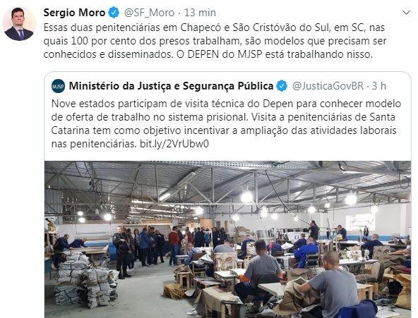 Em publicação no seu perfil no Twitter, nesta sexta-feira, o ministro da Justiça e Segurança Pública, Sérgio Moro, elogiou as penitenciárias de Chapecó e São Cristóvão do Sul. Esta última é única de Santa Catarina onde 100% dos presos trabalham. Moro retuitou uma postagem do Ministério que destaca a visita técnica do Departamento Penitenciário Nacional (Depen) às unidades.