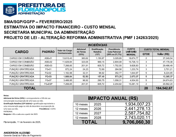 Um projeto enviado à Câmara de Vereadores de Florianópolis pelo prefeito Topazio Neto (PSD), no dia 21 de março, faz uma nova Reforma Administrativa na prefeitura da Capital. Depois de aprovar um texto no final de 2024 com a previsão de redução de gastos de R$ 500 mil nos próximos dois anos, agora o município terá um acréscimo de 28 cargos e funções gratificadas, com impacto orçamentário de R$ 9,7 milhões até 2028. Assim, será um aumento de R$ 7,7 milhões em comparação com a estrutura existente até o final do ano passado. A prefeitura alega trata-se de uma complementação diante da entrada de novos secretários e de funções que se mostraram necessárias, como a gestão do MultiHospital, no Sul da Ilha (veja abaixo o posicionamento completo).
