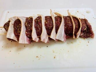 Modo de preparo: Após limpar o filé mignon, faça fatias se cortar até o final e coloque as fatias de bacon. Para ficar firme, utilize dois espetinhos de bambu e passe por todo o filé, evitando que o bacon caia na brasa durante o momento de assar. Em seguida, tempere com o sal e tempero do seu gosto e leve para a brasa ou para o forno.