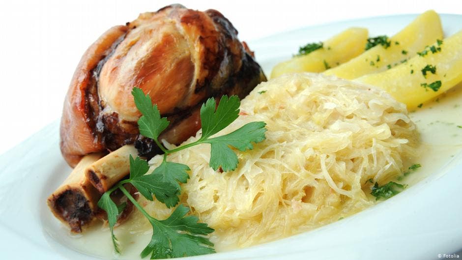 Normalmente, o eisbein é servido com chucrute e uma variedade de batatas tradicionais. Não esqueça de tomar um schnapps (cachaça) depois de comer, diz a tradição que ela ajuda na digestão.