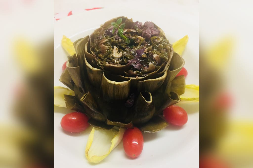 Antes de cozinhar, apare as pontinhas das folhas, recheie com fatias de azeitona preta e salsinha picada. Depois coloque em uma panela com água até a metade da alcachofra. Acrescente o suco de um limão, o sal a gosto, regue com azeite de oliva e coloque a panela no fogo.