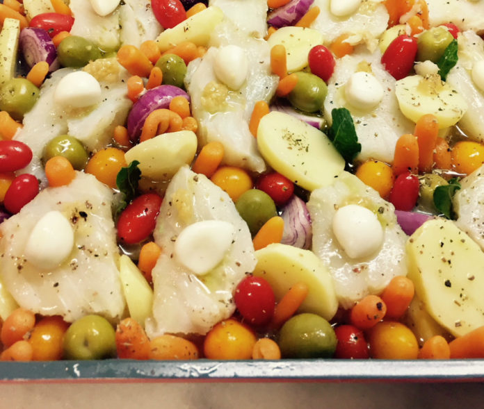 Preparo a travessa que irá ao forno com batatas cozidas, cebola roxa fatiada, mini tomates, azeitonas, alho, mini-cenouras, colocando os lombos sem a pele e as espinhas. E em seguida, utilizando um coador, adiciono a calda sobre todos eles e levo ao forno para assar.