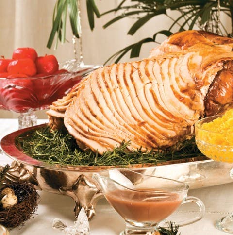 Retire o papel alumínio, pincele com o restante da manteiga e volte para o forno o peru por mais 1 hora. Sirva o peru com o restante da farofa e de o seu toque pessoal decorando com uvas, ameixas, morangos e pêssegos.