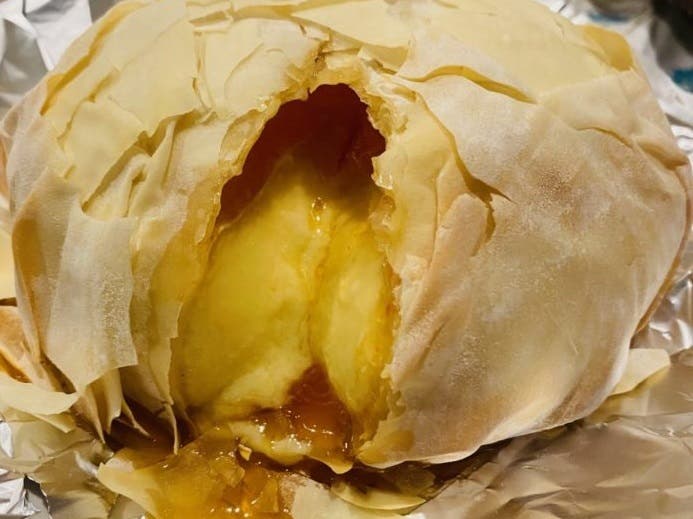Para preparar você vai precisar de um queijo tipo brie tamanho médio, que deverá ser coberto com geleia de pimenta. Depois, envolva toda a peça em massa folhada. Pincele a massa com uma gema de ovo e leve ao forno pré-aquecido e deixe até que fique dourado. Sirva com fatias de pão.