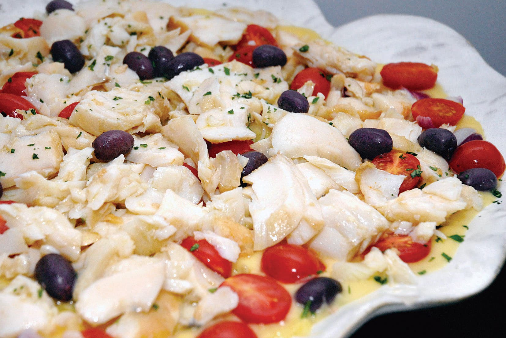 Grelhe o lombo de bacalhau até ficar bem dourado. Grelhe as cebolas até ficarem tenras. Após, solte as lascas do bacalhau conforme está na foto.