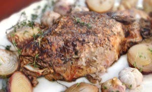 Acompanhamentos: cebolas e cabeças de alho assados na gordura do javali com alecrim e orégano fresco por uma hora e meia a 180o C.