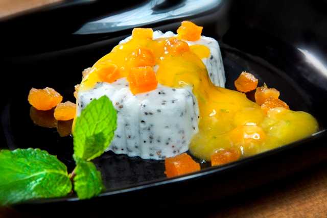 Para a calda, corte o damasco em cubos pequenos e leve ao fogo juntamente com o mel e o suco de laranja. Deixe reduzir até o damasco ficar quase na altura do caldo. Coloque as raspas de limão depois de desligar o fogo e deixe esfriar. Decore com uma folha de hortelã e sirva.