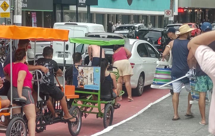 Imagem registrada pelo jornalista Rafael Weiss no fim da tarde desta segunda-feira (27) em Balneário Camboriú: um motorista estacionou em cima da ciclovia da Avenida Atlântica para buscar a família na praia. Enquanto enchia o porta-malas com cadeiras e guarda-sol, o trânsito ficou parado na ciclofaixa, nos dois sentidos, durante longos minutos – o suficiente para provocar um inusitado congestionamento de bicicletas e triciclos de aluguel.