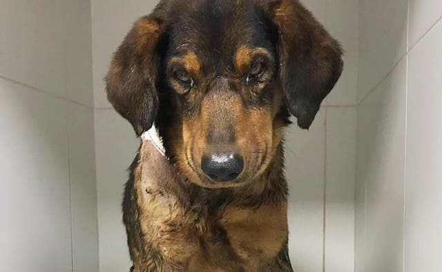 O cachorro socorrido pela Guarda Municipal de Balneário Camboriú, na última quinta-feira (16), após ter sido esfaqueado na Praia de Laranjeiras, segue em tratamento e já voltou a se alimentar. Seu estado de saúde, no entanto, ainda é grave.