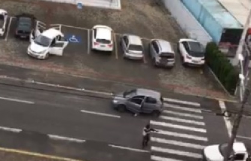 Imagens que circulam nas redes sociais mostram que eles deixaram um Fox prata trancando o acesso ao banco, e pararam o motorista no momento em que ele tentou passar. O homem teria sido levado junto na fuga.