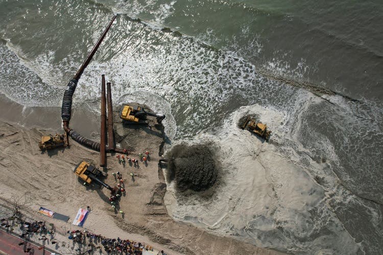 As obras ocorrem durante 24 horas para agilizar o trabalho da draga, que capta areia na jazida, a 15 quilômetros da costa, e despeja nos dutos que levam até a beira da praia. Ao todo, 88 trabalhadores estão envolvidos na empreitada – 28 estão a bordo da draga, e outros 60 se revezam em terra firme.
