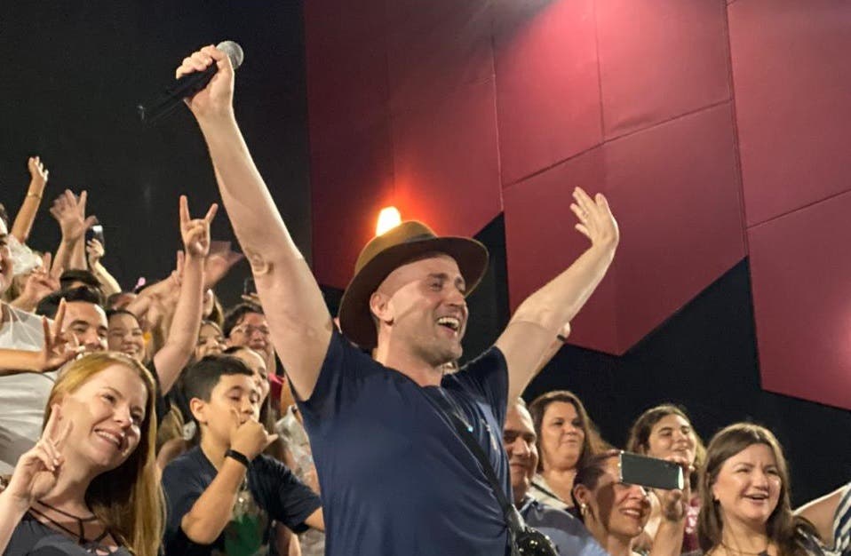 O ator fez fotos com os espectadores, brincou e "ensaiou" junto com a plateia. Depois da gravação, saiu pelos bastidores da sala de cinema.