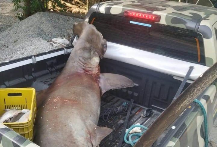 Há suspeitas de que o tubarão – um gigante de 211 quilos e quase três metros de comprimento – tenha sido atingido por uma rede de pesca. Como a captura é proibida, teria sido deixado para trás pelos pescadores.