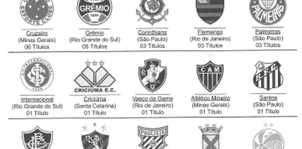 Daí, abaixo da ilustração com os escudos, são oferecidas cinco possibilidades matemáticas de respostas, mediante expressões de análises combinatórias. Os problemas já começam na soma dos títulos propostos no período exposto: de gaúchos, são 7, 5 do Grêmio, 1 do Internacional e 1 do Juventude. Do Rio são 5, 3 do Flamengo, 1 do Vasco e 1 do Fluminense. De Minas, são 7, sendo 6 do Cruzeiro e 1 do Atlético. De São Paulo, são 9 conquistas no período: Corinthians (3), Palmeiras (3), Santos (1), Paulista (1) e Santo André (1). A conta fecha com a taça catarinense (Criciúma) e de Pernambuco (Sport Recife, 1).