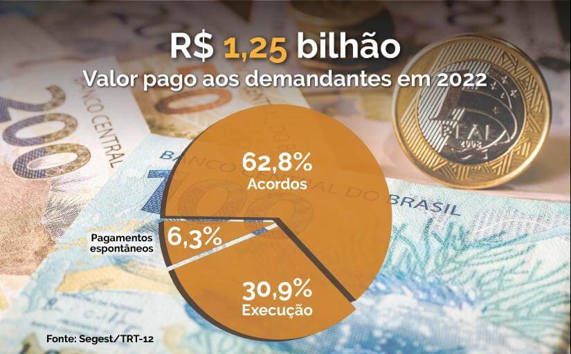 Balanço do Tribunal Regional do Trabalho em Santa Catarina (TRT-12) mostra que em 2022 a soma dos valores pagos em ações trabalhistas no Estado chegou a R$ 1,25 bilhão, 10% a mais do que no ano anterior, 2021. Um destaque foi o crescimento de 25% das quitações por acordos entre as partes, chegando a 62% do total. Os valores liberados com esses acordos somaram R$ 790 milhões.