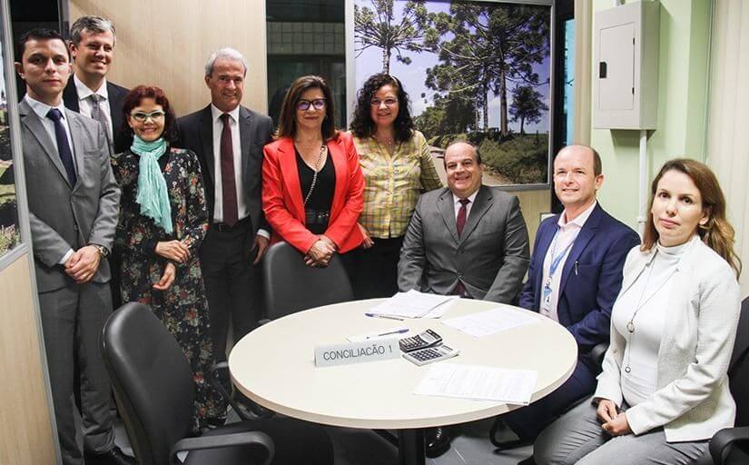 O número de conciliações chegou a 32% do total. Um dos acordos firmados era de um processo em espera há 14 anos, de um servidor da Caixa Econômica Federal. Na foto (de terno), o desembargador Wanderley Godoy Júnior, vice-presidente do TRT-12 (de Santa Catarina), com lideranças do tribunal e outros participantes da semana.