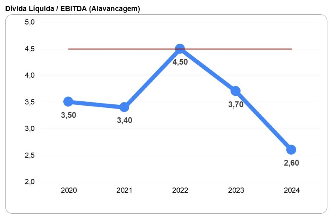 Os recordes foram registrados também na margem Ebitda e no perfil de endividamento. O Ebitda (lucro antes de juros, impostos, depreciação e amortização), indicador importante para geração de recursos operacionais, alcançou R$ 765 milhões no ano passado, 64% mais do que em 2023. A margem Ebitda atingiu 39% em 2024, o que confere a alta lucratividade da empresa.