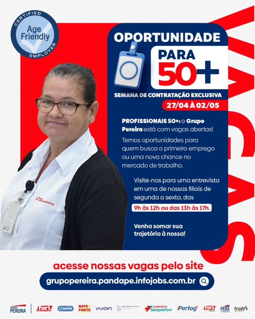 Profissionais com 50 anos ou mais, interessados em trabalhar em redes de supermercados ou de farmácias, podem buscar uma vaga no feirão do Grupo Pereira. São 2 mil oportunidades em três redes do grupo: o Fort Atacadista, os Supermercados Comper e a Farmácia SempreFort. Dessas vagas, 910 são em Santa Catarina e 1.090 em outros estados.