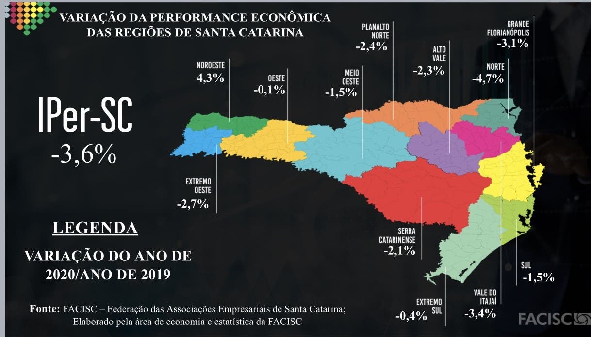 O Iper, Índice de Performance Econômica das Regiões de Santa Catarina, calculado pela Federação das Associações Empresariais de SC (Facisc), mostra que a pandemia derrubou, em média, 3,6% a atividade econômica do Estado em 2020, em série com ajuste sazonal. Apesar da alta de 10% no último trimestre, não foi possível um resultado melhor do índice que é baseado principalmente na receita de setores econômicos.