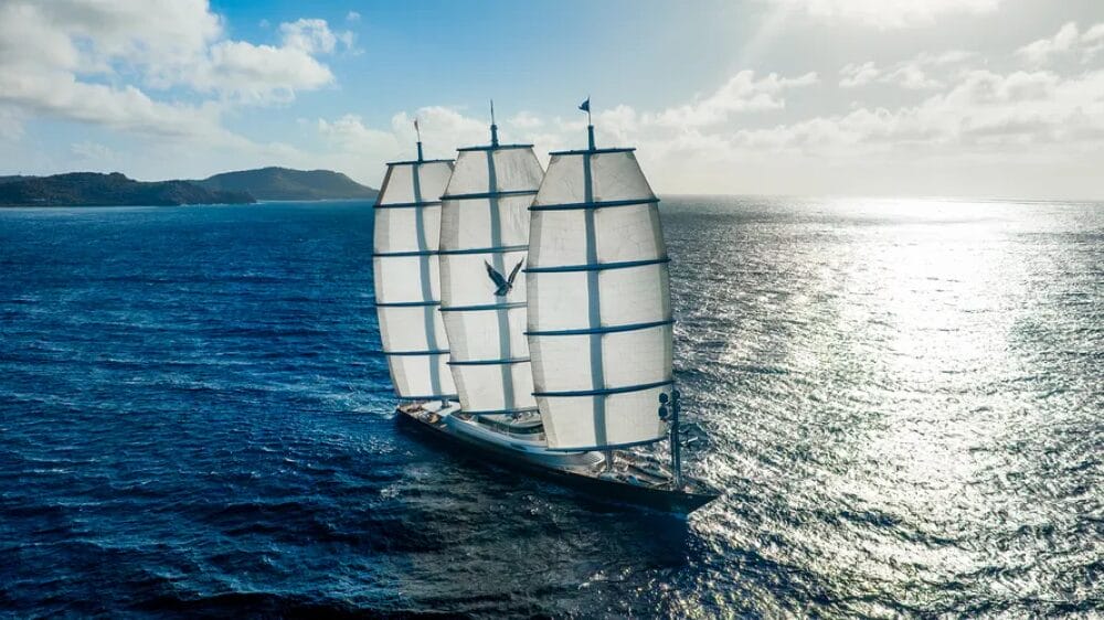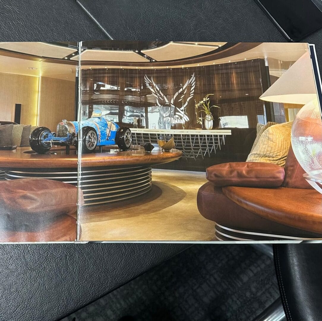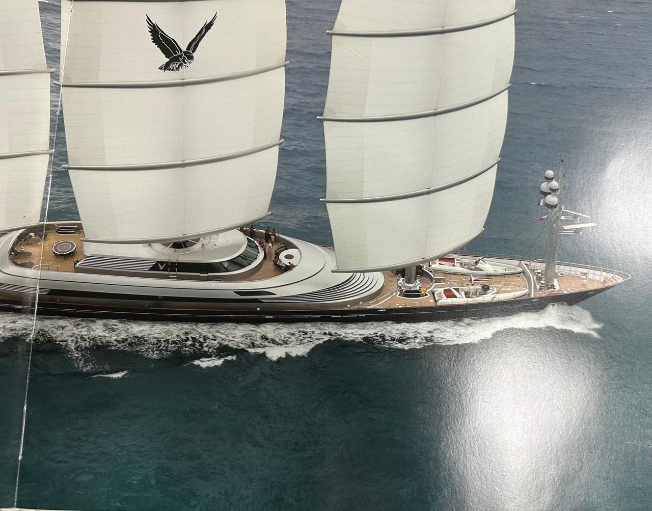 Veja um dos projetos (ele mostra um veleiro em tamanho miniatura no escritório). Esta vela é uma das patentes que registrei. Esse mastro gira. As velas são fixas, mas o mastro gira. Este foi um barco com muita inovação. Ele foi adquirido na época pelo empresário Tom Perkins, presidente da Compaq, dos EUA. Este barco é um navio. Levou cinco anos para ser construído e custou mais de US$ 100 milhões.
