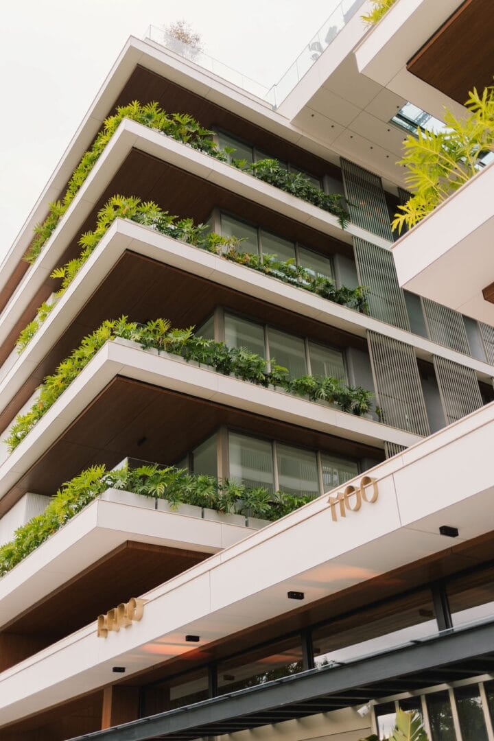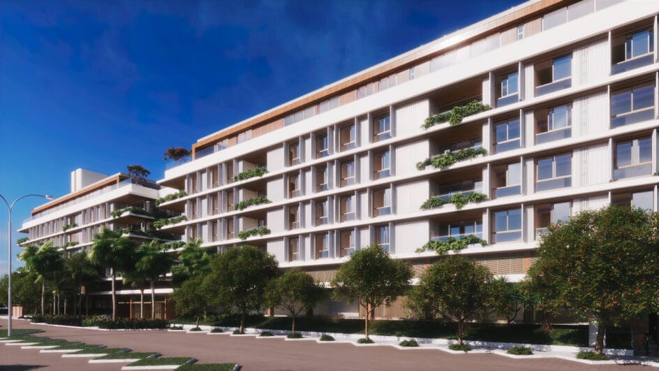 Um diferencial é que apartamentos contam com esquadrias do piso ao teto e fachada biofílica com jardineiras integradas. Isso cria uma relação direta do interior com o exterior.