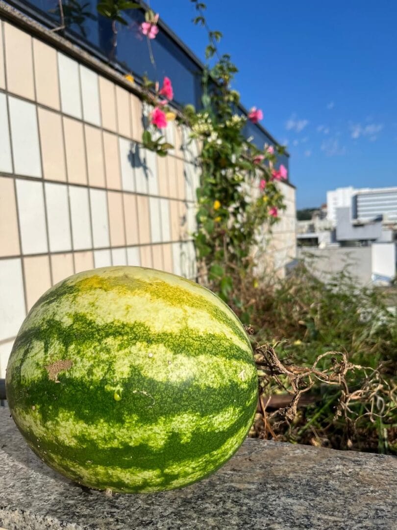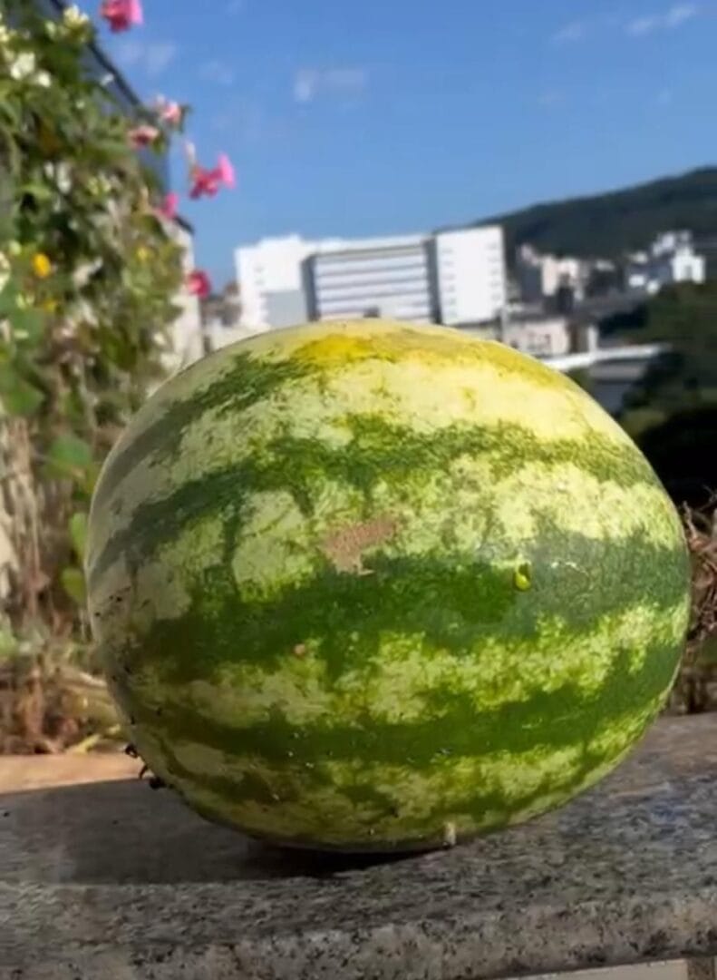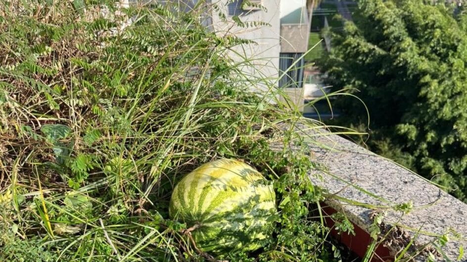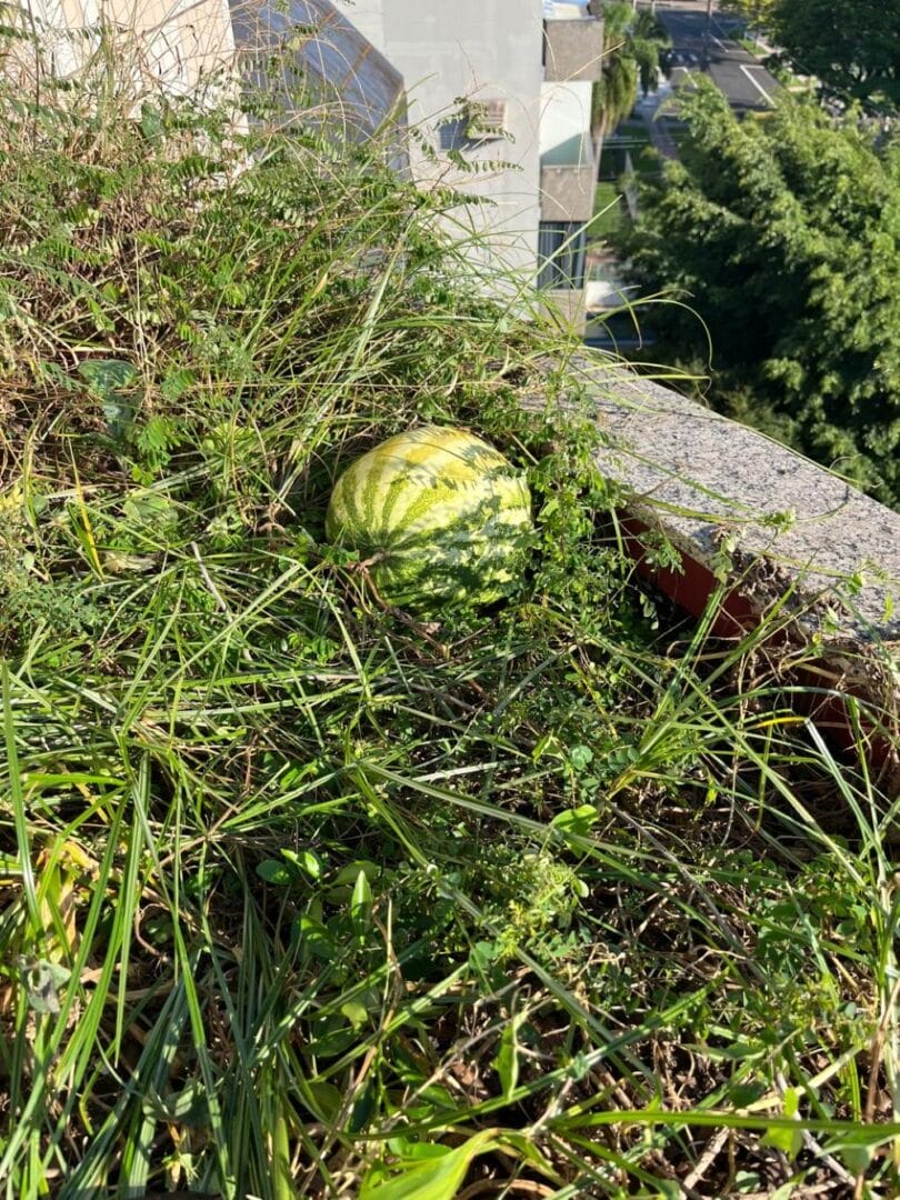 Notícia publicada pela coluna em 14 de fevereiro sobre horta orgânica na cobertura de um edifício de Criciúma, em Santa Catarina, chamou a atenção porque uma melancia cresceu pendurada na parede externa, nas alturas. Para protegê-la, o casal Ivo e Jassirene Carminati optou por uma solução mais prática, puxou o galho da planta e colocou a melancia dentro de uma floreira. Ela seguiu crescendo e, nesta semana, pouco mais de um mês depois, ficou madura e foi colhida.