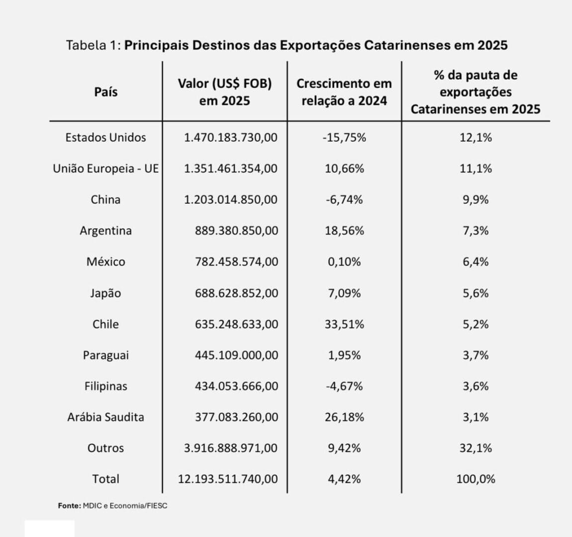 Santa Catarina encerrou 2025 com resultado recorde nas exportações, que cresceram 4,4% no ano e totalizaram receita de US$ 12,2 bilhões, mesmo em cenário adverso com o tarifaço dos Estados Unidos e barreira sanitária da China. O tarifaço reduziu em 15,7% as exportações aos EUA, gerando perda de US$ 275 milhões e a restrição da China ao caso da gripe aviária no Rio Grande do Sul reduziu em 6,74% as vendas ao país, com perda de US$ 87 milhões. Mas o crescimento de vendas em outros mercados compensou o resultado final, destaca a Federação das Indústrias do Estado por meio do Observatório Fiesc.