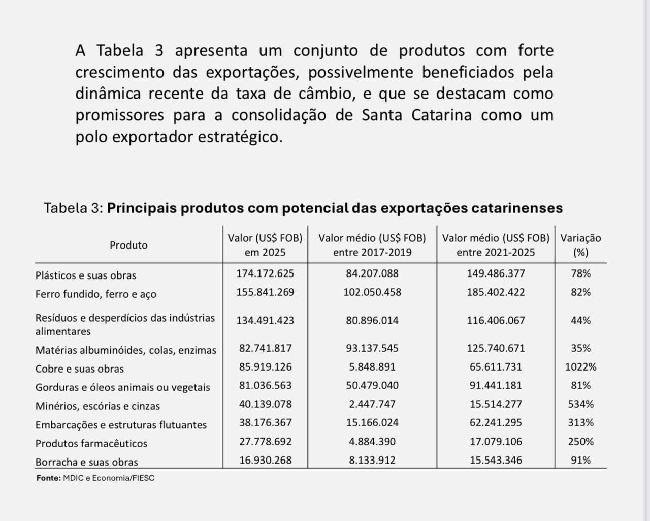 – É importante destacar que muitos segmentos tiveram perda com o tarifaço dos Estados Unidos. Especialmente a produção de madeira teve grandes perdas. Isso resultou, inclusive, em saldo negativo de emprego até agora no setor. Um estudo da Fiesc mostra que o tarifaço vem causando repercussões graves para Santa Catarina, especialmente para as regiões mais deprimidas do estado, que são o Planalto Norte e a Região Serrana – enfatiza Bittencourt.