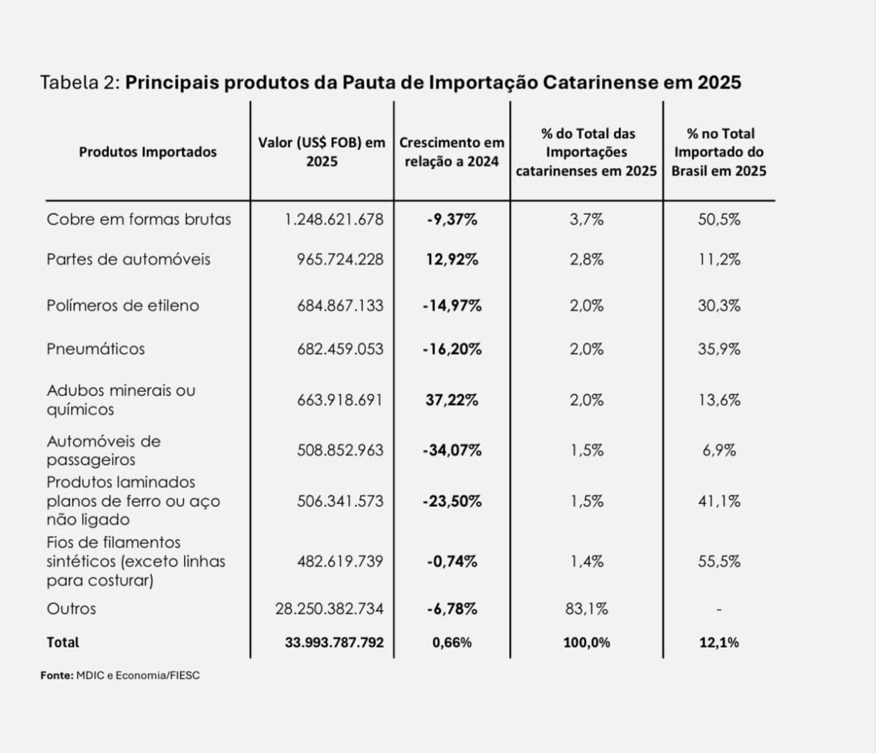 Os produtos mais importados por SC em 2025, segundo o Observatório Fiesc, foram cobre refinado (-9,4%), partes e acessórios para veículos, (+12,9%), polímeros de etileno (-15%), pneus de borracha (-16,2%) e fertilizantes nitrogenados(+37,2%).