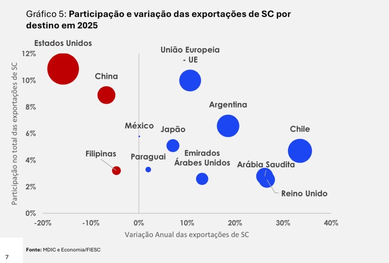 O mercado argentino respondeu por US$ 889 milhões das vendas de SC lá fora, com crescimento de 18,6% frente a 2024. Entre os destaques, de acordo com o economista, estão o crescimento das exportações de papel kraft, laminados de ferro e cobre, revestimentos cerâmicos além de refrigeradores e freezers.