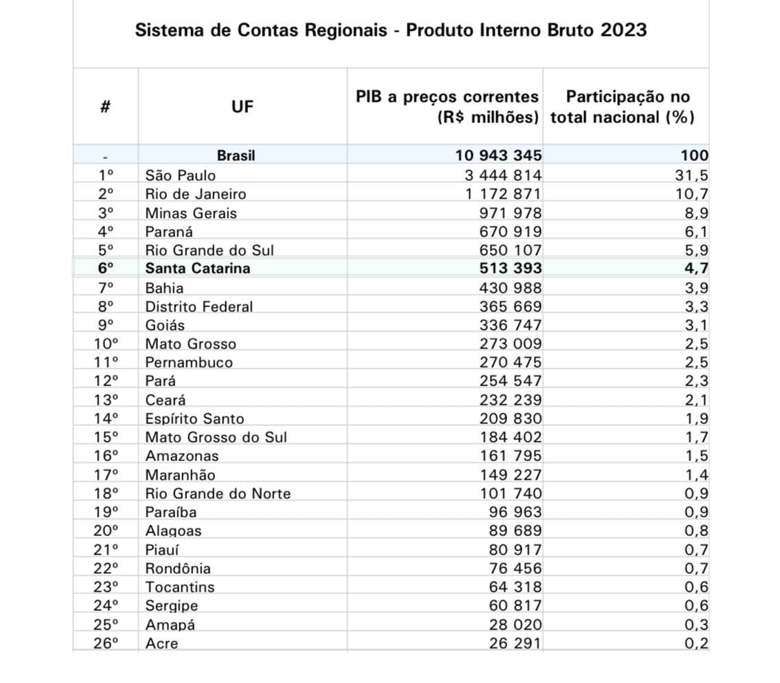 De acordo com o IBGE, os três estados do Sul tiveram leves ganhos em participação na geração de riqueza nacional, mas somente SC subiu de 4,6% para 4,7% de 2022 para 2023. O Paraná manteve 6,1% e o Rio Grande do Sul, 5,9%. Tanto em SC quanto no Paraná, a maior influência para esse avanço foi da agropecuária.