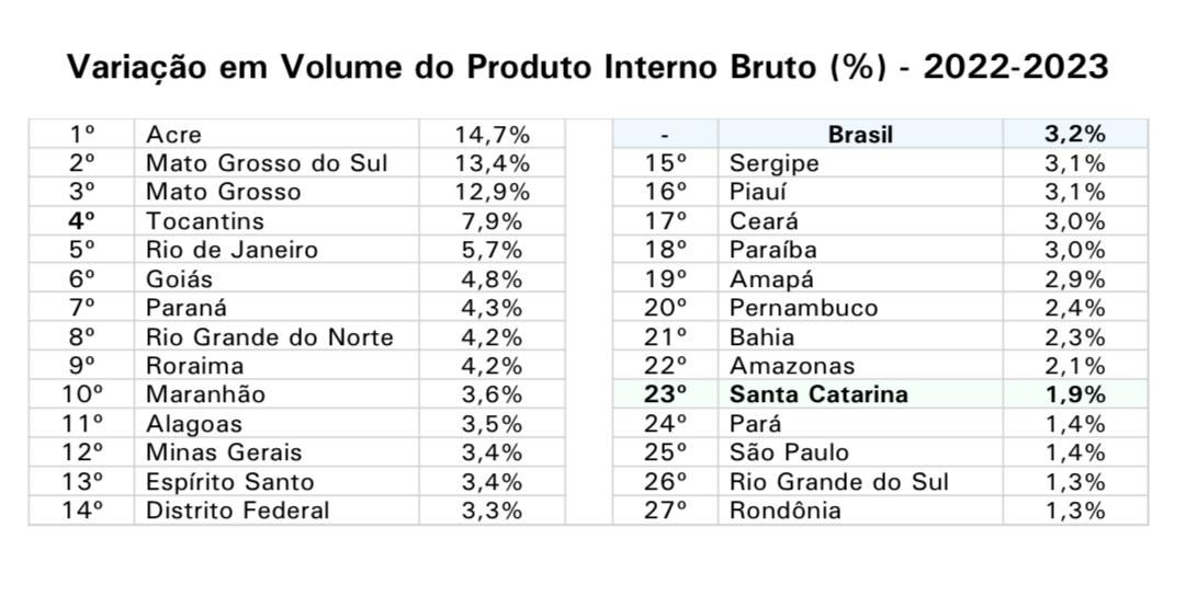A alta do PIB do estado em 2023 ficou levemente acima do 1,8% do ano de 2022, mas ficou abaixo do crescimento do PIB nacional, de 3,2% em 2023. A variação ficou também abaixo das projeções da prévia do PIB (BC) que indicava alta de 2,7% para SC em 2023. De acordo com o economista Paulo Zoldan, da Seplan, essa variação aquém ocorreu devido a retração da indústria naquele ano, mas também pela base alta de comparação que passou por uma acomodação após a robusta alta da economia estadual de 6,8% em 2021 no pós-pandemia, seguida por outra alta de 1,8% em 2022.