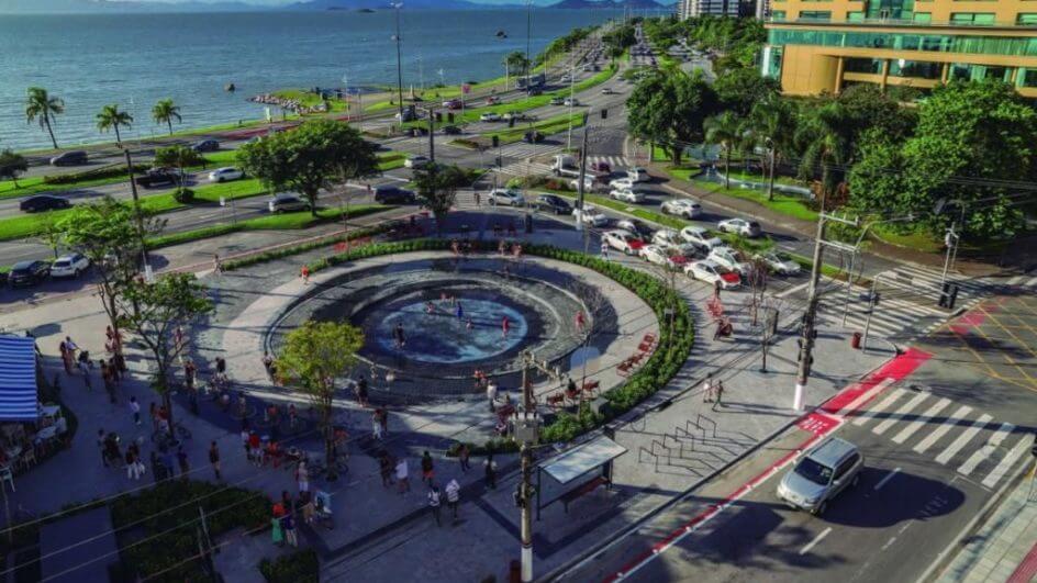 Criação da arquiteta Juliana Castro, do escritório JA8 Arquitetura Viva, de Florianópolis, o projeto inclui calçadas, bancos, árvores e um espelho d’água redondo com chafarizes. O montante investido no projeto foi uma doação do Beiramar Shopping e a praça foi construída por uma parceria público-privada (PPP) entre a prefeitura da cidade e o Grupo Habitasul.