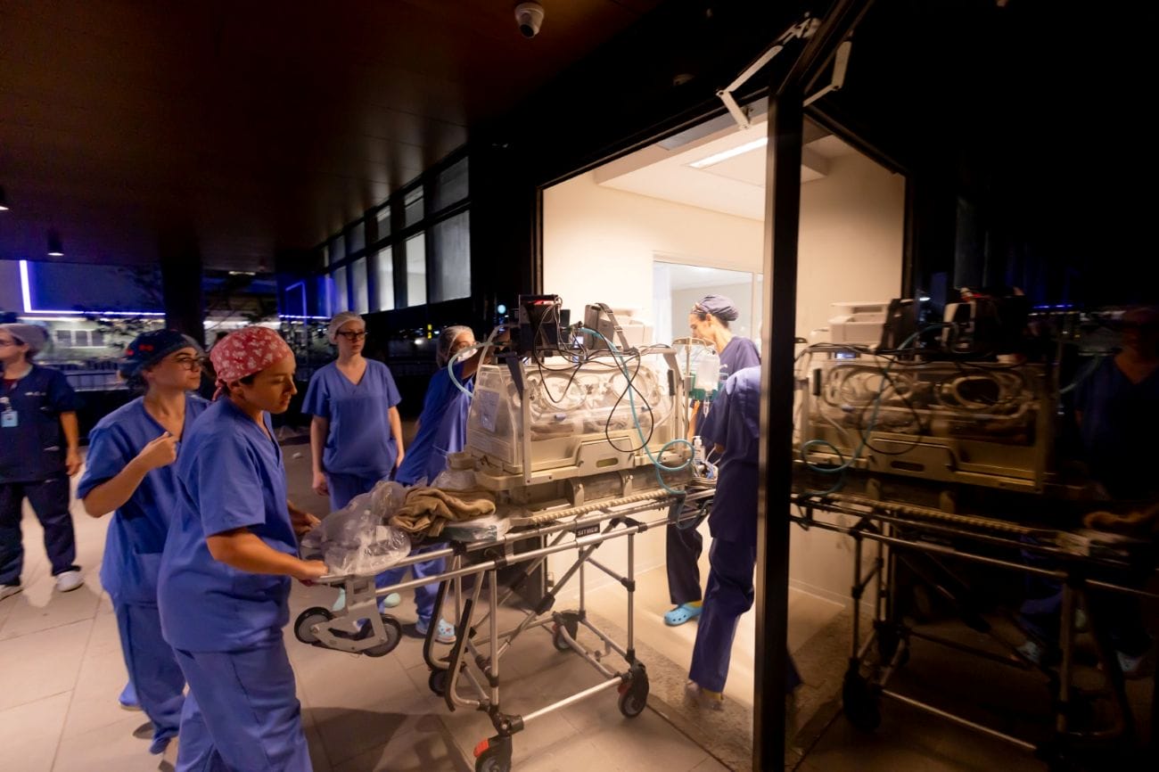 A diretora do Hospital Baía Sul Mulher, Gabriela Brincas, revela que esse foi o maior desafio da implantação do novo hospital, mas também o mais emocionante. Foi definido um esquema especial com equipes médicas da UTI, ambulâncias de cuidado intensivo e o apoio da Guarda Municipal porque o transporte foi em baixa velocidade para garantir a estabilidade e saúde dos bebês.