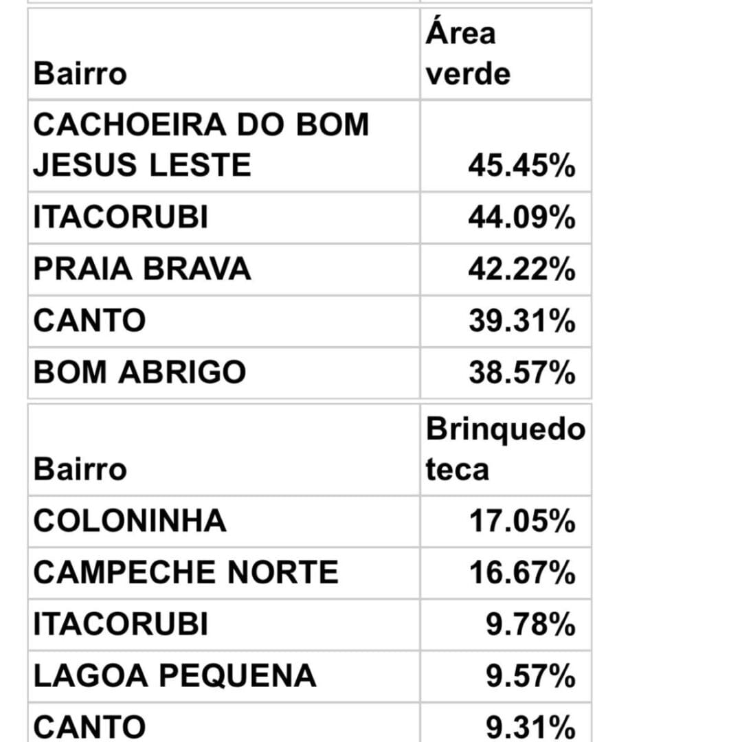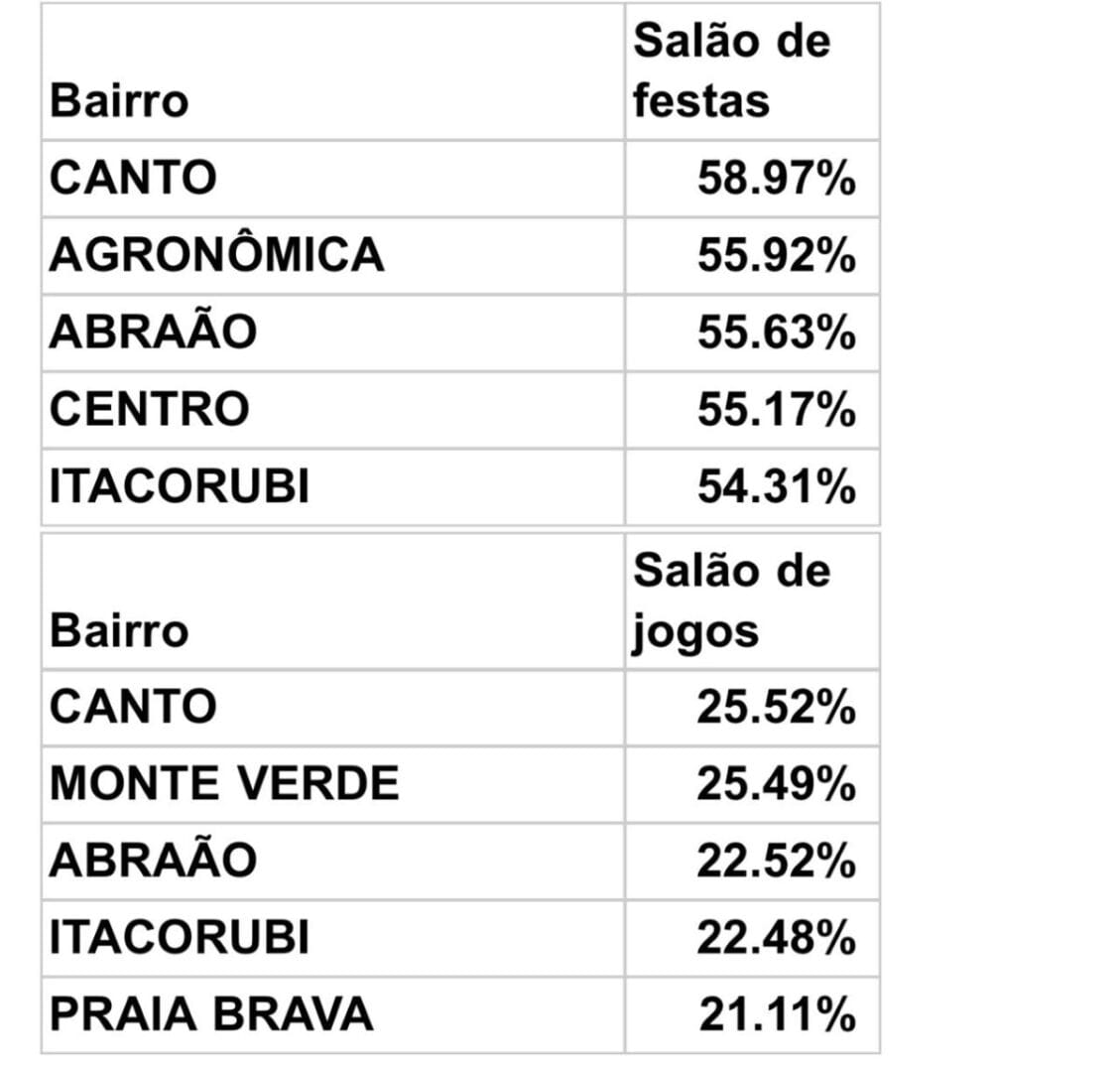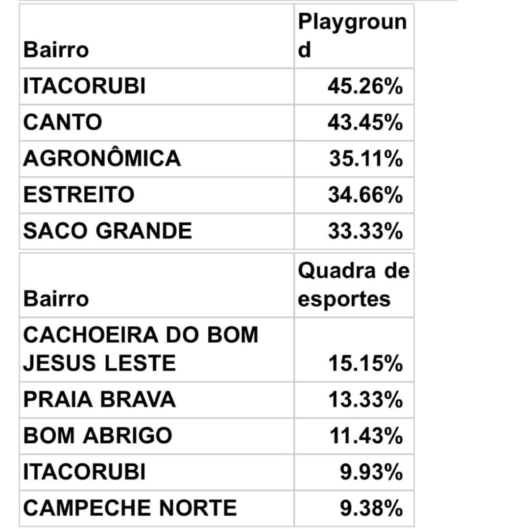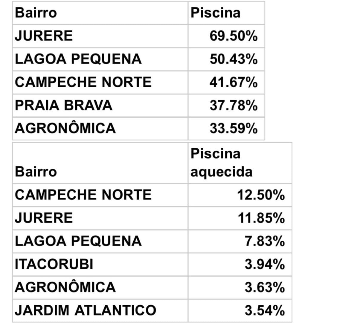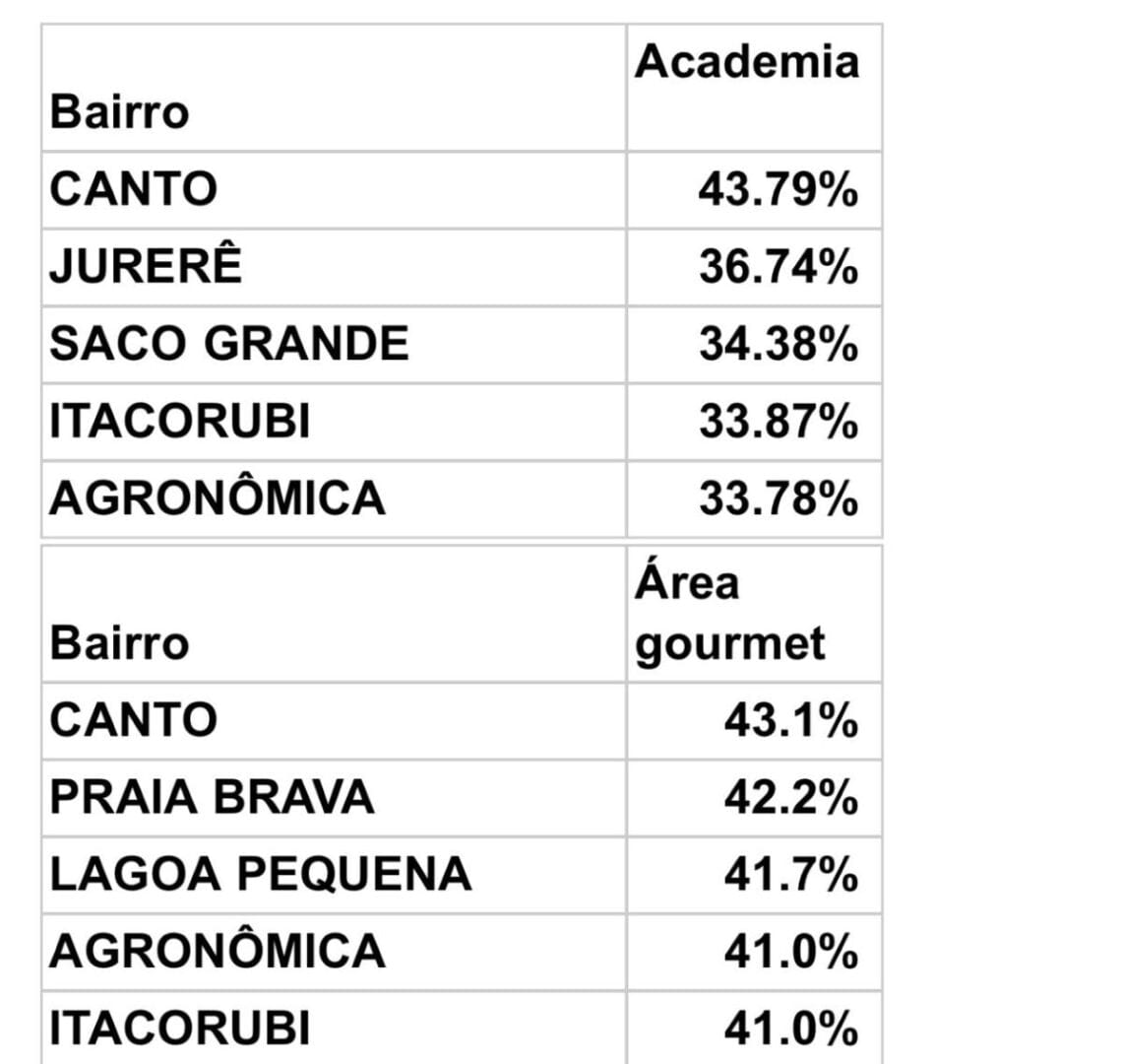 No bairro Canto (também conhecido como Canto da Lagoa), mais de 40% dos imóveis têm academia de ginástica, área gourmet e salão de festas. O Itacorubi se destaca na oferta de itens diferentes, incluindo playground, área verde e piscina aquecida.