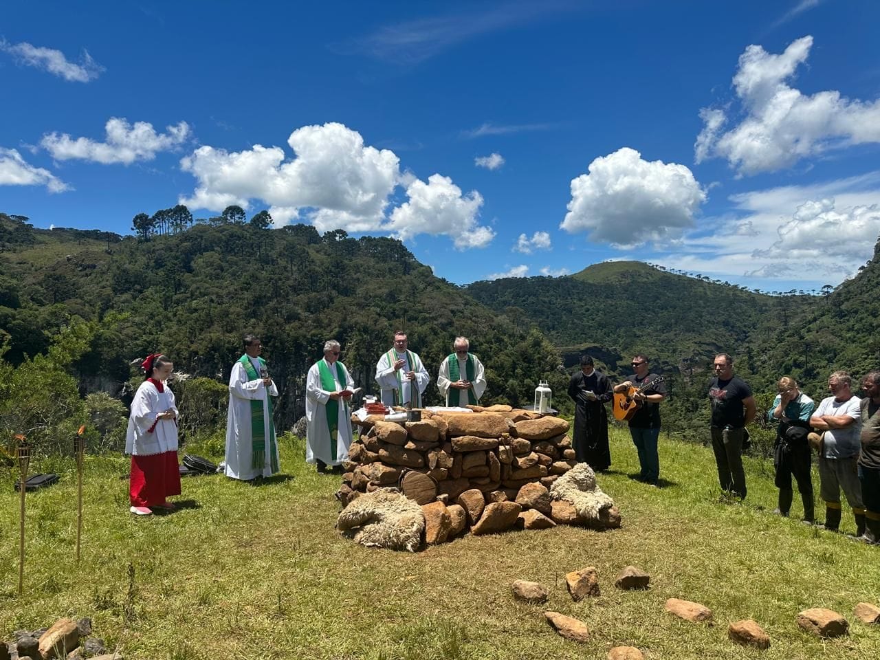 Veja mais fotos sobre a missa ao ar livre no Campo dos Padres, ao lado de cachoeira: