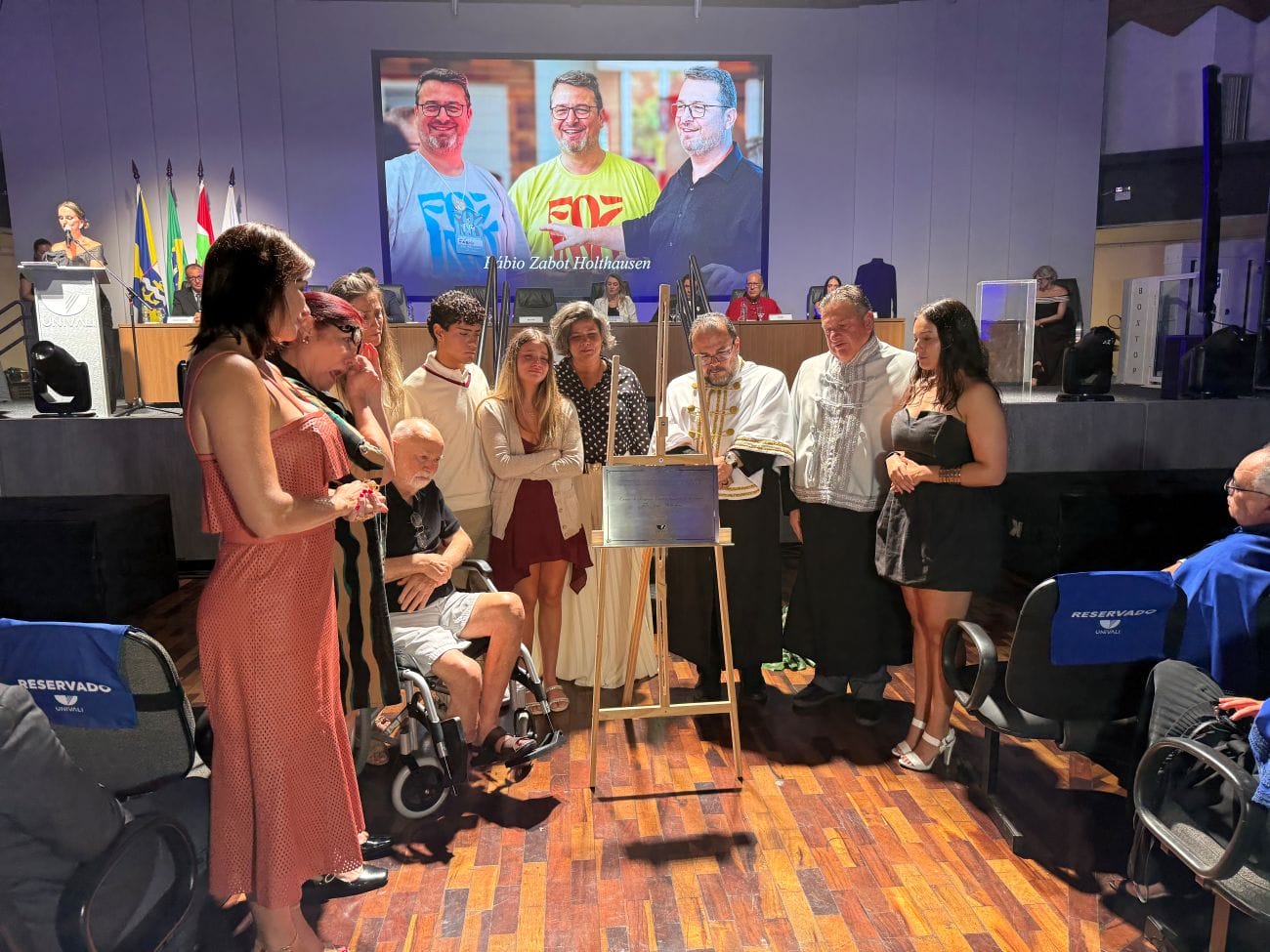 A cerimônia de posse do professor Rogério Corrêa como reitor da Universidade do Vale do Itajaí (Univali), sucedendo o professor Valdir Cechinel Filho, na noite desta terça-feira (24) teve uma cerimônia especial. Também contou com homenagem póstuma ao professor Fábio Zabot Holthausen, que faleceu dia 9 de fevereiro. O novo reitor anunciou que a unidade da Univali no Sapiens Parque, em Florianópolis, passa a ser denominada Centro de Pesquisa, Desenvolvimento e Inovação Fábio Zabot Holthausen, e o prêmio de inovação da instituição também passou a levar o nome do professor.