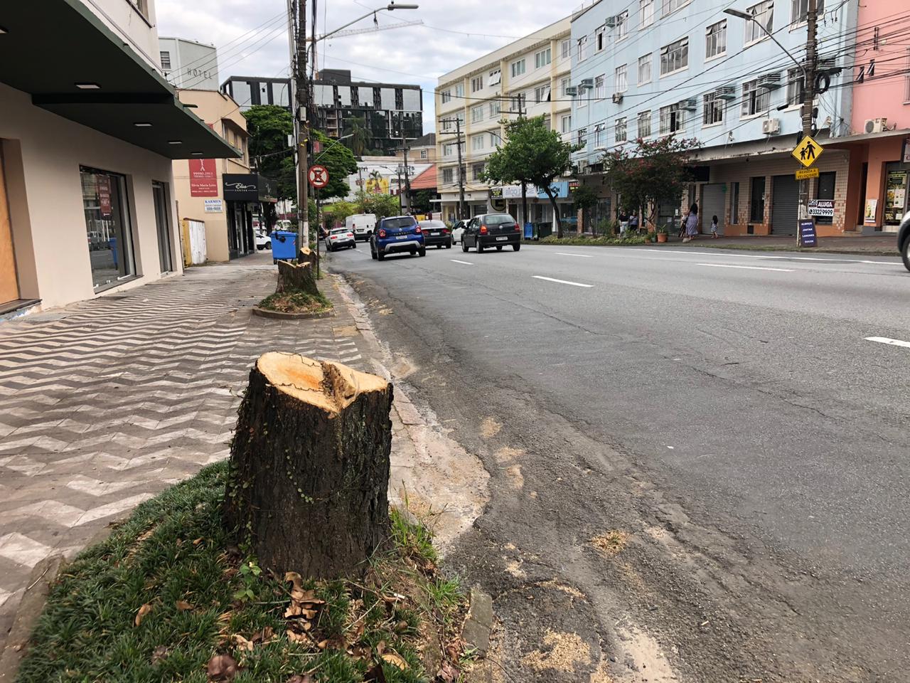 A Rua 7 de Setembro, no Centro de Blumenau, começou 2021 sem quatro das frondosas árvores que faziam sombra aos pedestres. Elas foram cortadas nos últimos dias do ano passado, com autorização da prefeitura, pelo centro comercial Galeria Estação, que está em reforma — o prédio da antiga rodoviária. A empresa vai reurbanizar a calçada e plantar ipês-amarelos nos canteiros.