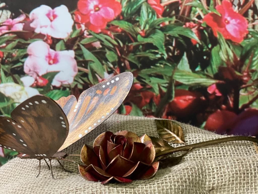 São duas peças em metal. A primeira é uma rosa que faz referência a Hermann Blumenau, porque era uma de suas paixões. A segunda é uma borboleta que alude às pesquisas de Fritz Müller sobre o mimetismo. Junto das obras é entregue uma carta com um texto explicativo.