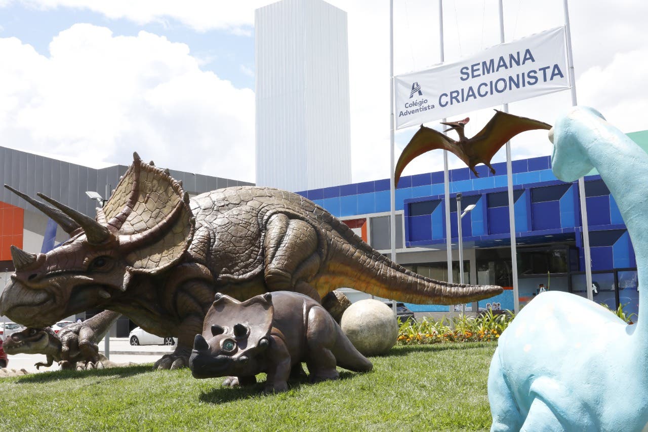 Dinossauros expostos no jardim do Colégio Adventista, em Blumenau, despertam curiosidade por quem passa pela região da Itoupava Seca nesta semana. As réplicas diante da escola integram uma programação voltada ao criacionismo, a crença de que a vida e o universo são obras divinas. Instituição confessional e privada, a Adventista defende o ensino do que chama de duas versões: o criacionismo e o evolucionismo.
