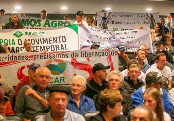 Prefeitos, deputados, a procuradoria-geral do Estado, empresários e representantes do setor agrícola falaram a uma plateia assustada com a possibilidade de terras escrituradas há décadas virem a ser questionadas por processos de demarcação. Ônibus com agricultores de Cunha Porã e Saudades viajaram 12 horas para participar da audiência.