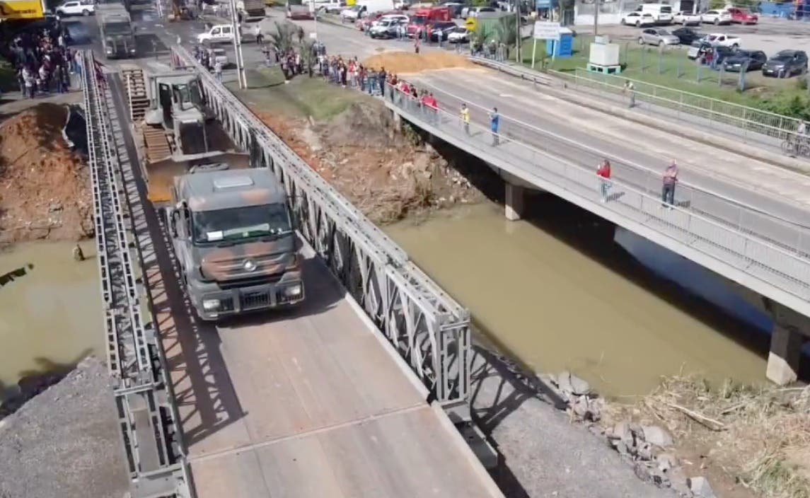 O ministro disse que o tráfego no local “foi liberado”. Na verdade, a passagem provisória comporta apenas um veículo por vez. O tráfego segue no sistema pare-siga.