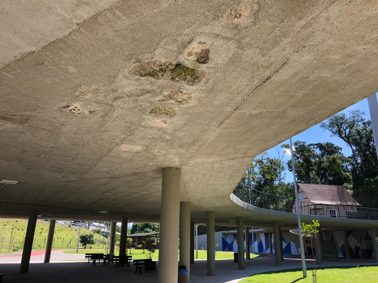 Os problemas mais visíveis estão no entorno da marquise de concreto, destaque do espaço de lazer. Em vários pontos há goteiras, rachaduras e pedaços de ferro à mostra. A aparência é de uma estrutura maltratada pelo tempo — o parque levou seis anos para ser entregue. Quem caminha por baixo da cobertura ouve e sente a fragilidade da camada de cimento aplicada no piso. Nas beiradas, o material esfarela-se.